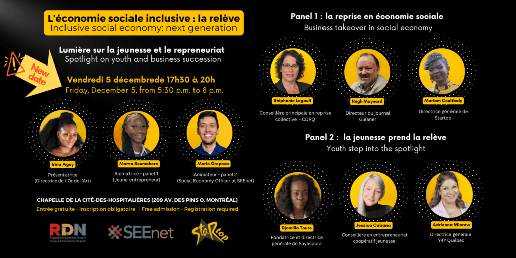 SEEnet and Startop invite you to a free, province-wide gathering in Montreal on Friday, December 5, from 5:30 to 8 p.m at La Chapelle de la Cité-des-Hospitalières (209 Avenue des Pins Ouest). A new generation of social economy professionals and collective takeovers will be at the heart of the discussions.